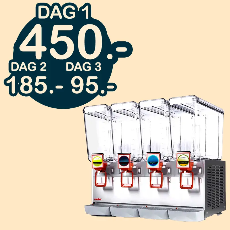 Med fire store beholdere Ă 20 liter kan du tilbyde flere smagsvarianter og have rigeligt til selv de stĂžrste fester.
